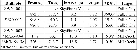 - SW20-002 intersected several intervals of anomalous Carlin-Type alteration and narrow intervals of elevated gold-silver mineralization including: