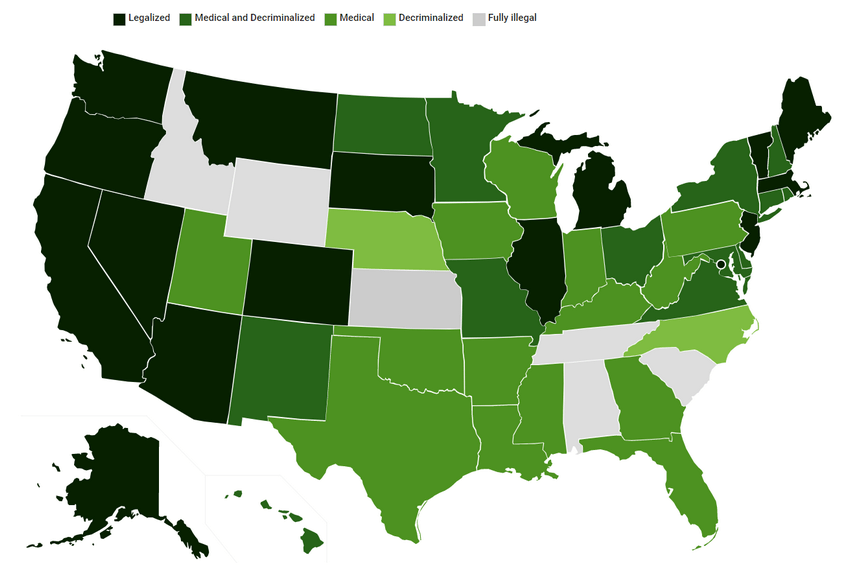 Legalization & Acceptance of Marijuana within the US has now reached almost every state – with only six states still showing Marijuana is fully illegal. All other states have adopted Marijuana use in some form over the past 5+ years.