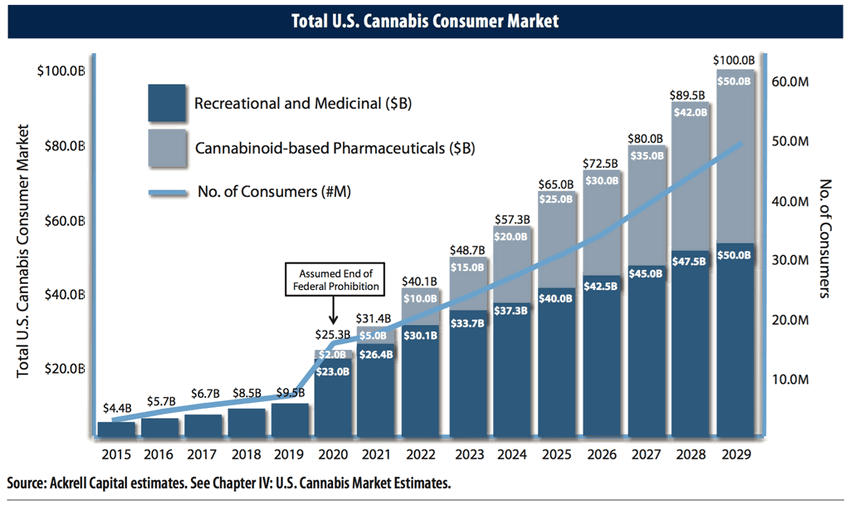 Using these two sectors for comparison, the first question is just how big is the Cannabis/Alt marketplace compared to similar types of markets? The Cannabis sector currently makes up about 1/10th of the total US Alcoholic beverage annual sales ($25.3B Cannabis: $252.82B Alcohol – https://www.statista.com/topics/1709/alcoholic-beverages/). From a conservative standpoint, Cannabis consumers very likely cross-over into the Alcoholic beverage consumer market on a fairly high basis. This means the consumer market for Cannabis is very likely 60% to 75%, or more, of the Alcoholic-beverage market.