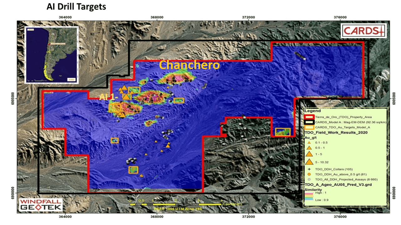Previous exploration data generated by both the company and other historic operators have been compiled and 8,660 training points were subjected to evaluation by Windfall’s propriety CARDS AI model. CARDS uses data mining techniques to analyze compiled exploration data and to identify areas target zones with high statistical similarity to known “signatures” of areas of copper, gold, and silver mineralization (Figures 3 and 4 below). A total of thirteen (13) prospective target zones were identified by the prediction analysis, of which in Phase 1 the company has elected to drill test two of the zones.