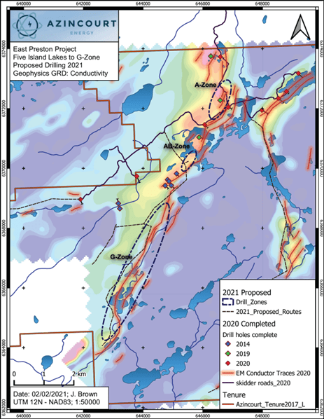 As previously reported, targeting for the 2021 drill program is the conductive corridor from the A-Zone through to the G-Zone (Figures 2 and 3, below) and is based on a compilation of results from the 2019 and 2020 drill programs, 2018 through 2020 ground-based EM and gravity surveys, and property-wide VTEM and magnetic surveys.