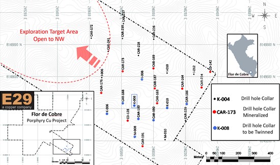 - Historical total copper (“CuT”) assay results and drill logs obtained by Element 29 from legacy drilling completed by Rio Amarillo Mining Ltd. and Phelps Dodge Corporation at Candelaria during the 1990’s were used to calculate copper assay intervals for the select drill holes provided in Table 1 of this press release. These historical assay results and drill logs are relevant to Flor de Cobre as they suggest supergene-enriched copper mineralization of interest may be present at Candelaria. Assay certificates were provided by Geochemical Lab Geolab Peru S.A. for assay results received by Phelps Dodge Corporation but no assay certificates were obtained for the Rio Amarillo Mining Ltd. assay results. Additionally, none of the diamond drill core and sample rejects from these drill holes are currently available for geochemical analysis, which prevents a qualified person from verifying the copper geochemical results provided. For these reasons, the historical copper geochemical assay results from Table 1 should not be relied upon.