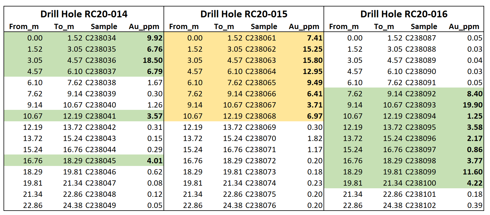All three (3) drill holes in this release are from the Eagle Zone and the drill intersections are estimated to be approximate true widths. Two of the RC drill holes collared in the better grade mineralization and the third hole intersected the mineralized shear at a shallow down-hole depth. Significant assay results from three RC holes are reported below.