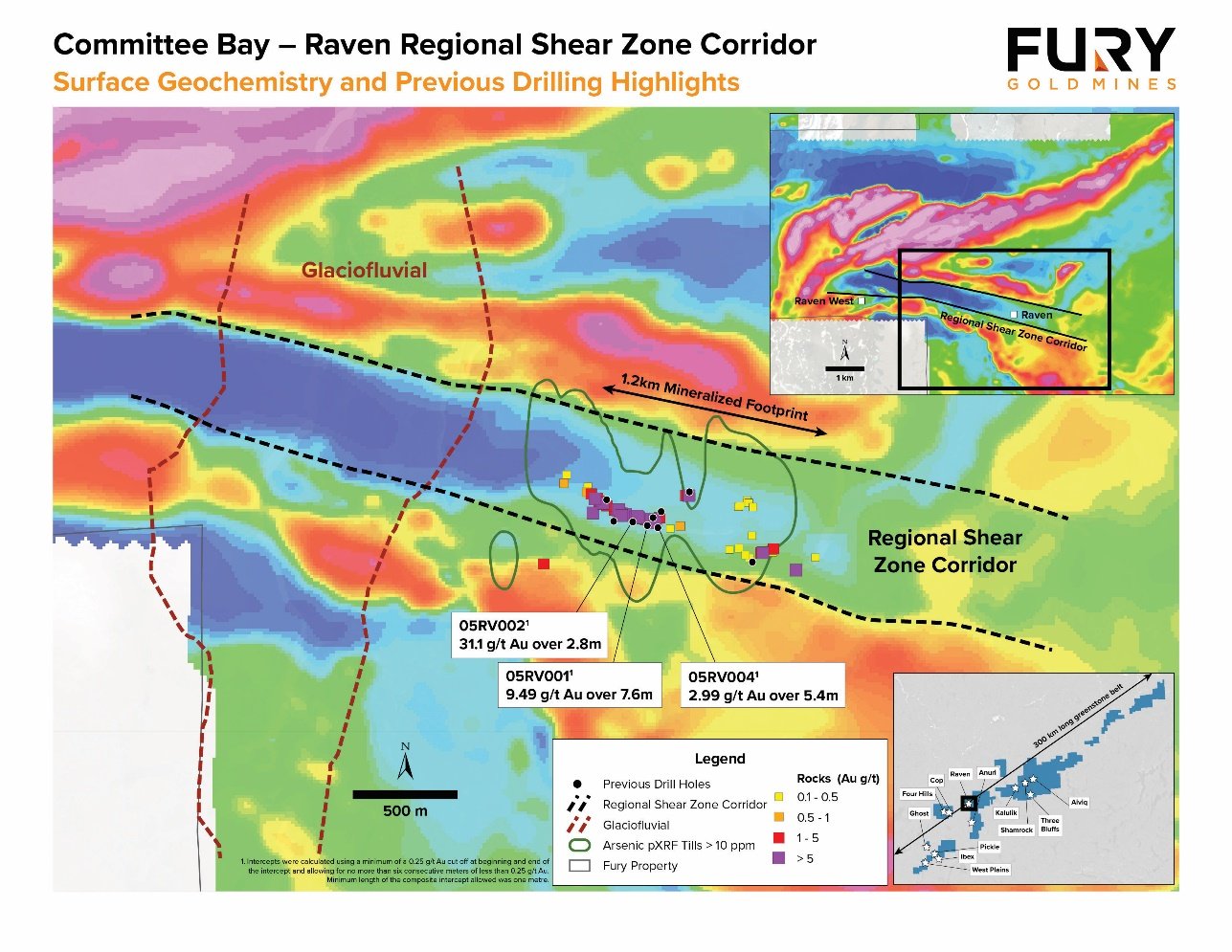“Our technical team views the high-grade veins at the Raven prospect as the highest probability for a major discovery on the belt this year as the historical drilling positions us for the ability to rapidly expand the body through aggressive step outs. In addition, we will continue to advance our high-priority geophysical targets through the critical step of mapping to define geometry as we advance these targets to drill stage,” commented Michael Henrichsen, SVP, Exploration of Fury.