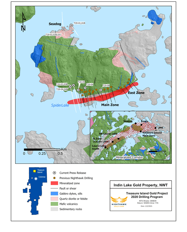 TORONTO, ON / ACCESSWIRE / February 3, 2021 / Nighthawk Gold Corp. (“Nighthawk” or the “Company“) (TSX:NHK)(OTCQX:MIMZF) is pleased to report assay results for twelve (12) drillholes (4,325 metres) from the 2020 drilling campaign on the Treasure Island Gold Project (“Treasure Island”), located within the northern section of its Indin Lake Gold Property, Northwest Territories, Canada (Figure 1; Table 1).