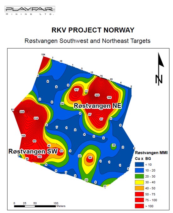 Playfair carried out a MMI geochemical survey in an area centered 800 metres East of Røstvangen Mine and discovered two high copper anomalies, Røstvangen Southwest (8 MMI Cu values over 50 times background) and Røstvangen Northeast (5 MMI Cu values over 50 times background).