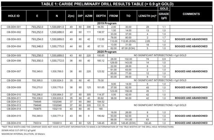 In the majority of cases, individual drill holes at Caribe have been unable to reach their planned objective due primarily to the effect of highly absorbent clays (formed within the host rock as part of the gold mineralizing process) swelling and arresting the drill rods. The Company has now completed a total of 20 drill holes and has briefly suspended the program in order to exchange the current drilling rig for a more powerful machine with the capacity to drill through the problematic clay and test the continuity of gold mineralization at depth.