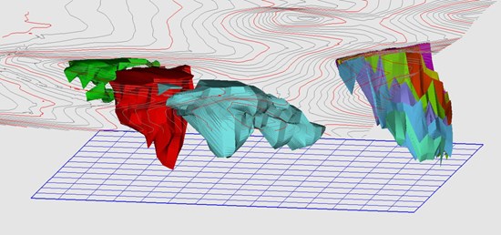 Map 1: it is looking 350 and down 10. Pipe 1 red, Pipe 2 green, Pipe 4 cyan, Mungu to right multicolours. Blue coordinate grid 100 m spacing. Topo contoured at 2 m intervals grey, 10 m red.