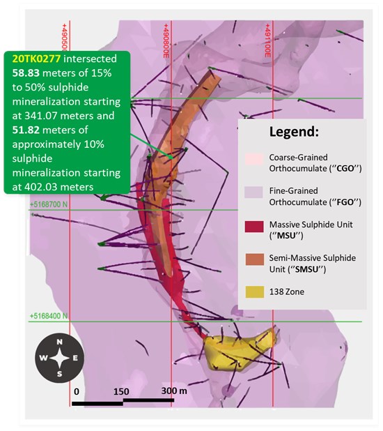 Drill hole 20TK0277 was a 25 meter step out from historic drill hole 08TK0089, which intersected 83.5 meters (274 feet) of sulphide mineralization grading 2.77% Ni, 1.45% Cu, 0.07% Co, 0.14 g/t Pd, 0.19 g/t Pt and 0.13 g/t Au (3.5% NiEq1 or 9.35% CuEq2), starting at 326 meters (see Figure 3), including a semi-massive sulphide intercept of 50.85 meters (167 feet) grading 3.80% Ni, 1.89% Cu, 0.09% Co, 0.16 g/t Pd, 0.22 g/t Pt, 0.14 g/t Au (4.75 % NiEq or 12.66 % CuEq), starting at 353.15 meters. Within the same drill hole, there was an additional lower interval of 70.5 meters (229 feet) of 2.13% Ni, 1.16% Cu, 0.05% Co, 0.36 g/t Pd, 0.56 g/t Pt and 0.26 g/t Au (2.88% NiEq or 7.69% CuEq), starting at 412.50 meters.