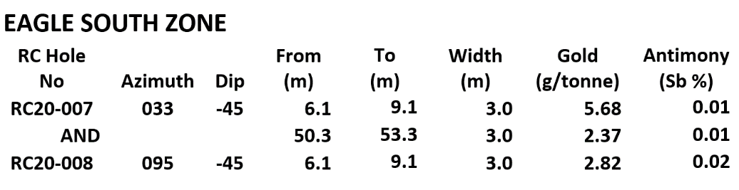 Eagle South Zone – Two holes were completed at the Eagle South Zone to test for gold mineralization below the outcrop channel samples that returned 13.4 m grading 6.92 gpt Au (see News Release October 15, 2020). Results are reported below.