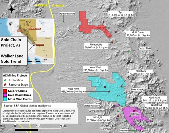 Ottawa, Ontario–(Newsfile Corp. – March 17, 2021) – Gold79 Mines Ltd. (TSXV: AUU) (“Gold79” or the “Company”) is pleased to announce results from the recent surface exploration work on its Gold Chain Project in Mohave County, Arizona. The Gold Chain project is located in a historic gold mining district in western Arizona. Several companies are advancing the exploration and development of epithermal gold deposits within and adjacent to the Oatman Mining District. Over 2 million ounces of gold have been produced from Oatman’s epithermal veins. An overview of this activity is shown in Figure 1 below.