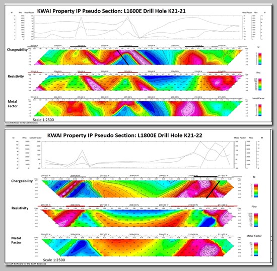 Prior to the extensive break in operations (February 8 until March 1) caused by extreme cold weather and drill problems, two drill holes (K21-15 and K21-16), were completed on lines 4900E and 4700E, about 2.3km east of Beauregard lake. These two holes were the first of a set of five holes planned to test an IP target trend that lies just south of the main Pakwash break, a second set of five holes is planned to test the IP targets on the north, along the Pakwash Fault itself.