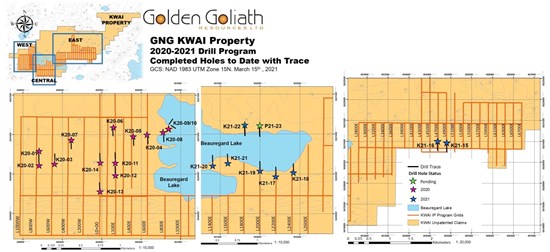 Golden Goliath Resources is pleased to report that drilling of a new IP trend, partially generated by the survey on the frozen lake, has now been completed. Five holes (K21-17, 18, 19, 20, & 21 -see Fig. 5) have traced a sericite alteration zone with sections of intense silicification and sulphide content over 20%, for a 1.2 km distance between lines 1200E and 2400E. Some of this anomaly trend is on land and some sections are under the shore of the lake and in the bay adjacent to the West Grid. Those anomalies were generated by the IP survey conducted on the frozen lake (Fig. 2 & 3). It also extends westward from line 1200E across the water to line 600E on the West Grid. This anomaly is distinctive in shape and often shows a classic “pantleg” anomaly, a narrow chargeable anomaly near surface of 10m width. The south shore anomaly was tested first because the drill had already been moved to that area of the lake for access to water. Further infill drilling and undercut holes are anticipated for this trend once the access route has dried up and or refrozen.