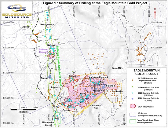 Steve Parsons, P. Eng., and CEO of Goldsource, commented, “Not only is the 2021 drill program confirming the continuity of mineralization in the Ounce Hill and Bacchus areas of the Eagle Mountain deposit, but it is also delivering several enhancements. Higher grades in the Ounce Hill area, with continuous gold mineralization over the reported intersections underscores the prospectivity of Ounce Hill in terms of expanding the higher-grade footprint. For the Bacchus area, discovery of up to four mineralized horizons or zones with the step-out drilling to the northwest is a noteworthy development. While our understanding of the granodiorite and mafic contact is evolving, the possibility exists for further expansions to the north and north-west direction along the lateral extent of the Eagle Mountain deposit. This potential will be tested in the coming months.