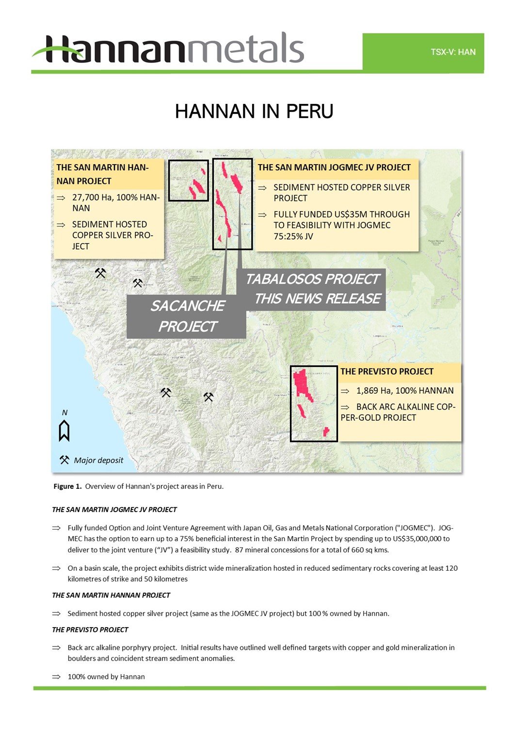 VANCOUVER, BC / ACCESSWIRE / March 9, 2021 / Hannan Metals Limited (“Hannan” or the “Company”) (TSXV:HAN)(OTC PINK:HANNF) provides assay results from the first outcrop copper-silver discoveries from the Tabalosos project held within the San Martin JOGMEC JV sediment-hosted copper-silver project in Peru (Figures 1 and 2).