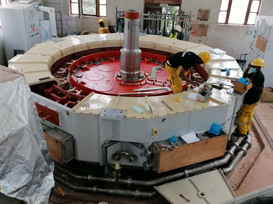 Engineers completing the alternator assembly for Mwadingusha’s sixth generator unit.