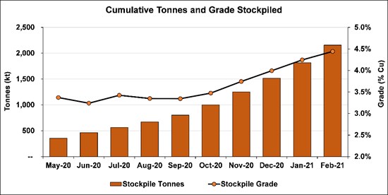 February’s ore production was 13% higher than January at slightly higher grades; pre-production surface ore stockpiles now total approximately 2.16 million tonnes grading 4.44% copper