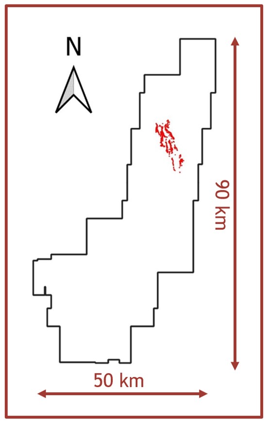 Figure 1. Plan view of Tiria-Shimpia target area showing its central location in the Lost Cities – Cutucu concession area. Footprint of silver in soil shown.