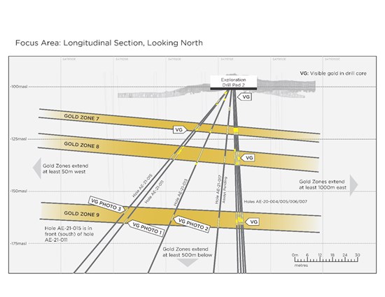 Holes AE-21-011, AE-21-013 and AE-21-015 are part of a series of inclined holes designed to intersect and expand the new gold zones to the west of previously reported AE-20-007 (see April 6, 2021 press release). Multiple gold zones were intersected by each of the three reported holes, including the high-grade Gold Zone 9 and Gold Zone 10. Holes AE-21-011 and AE-21-015 extend the gold zones approximately 50m west of previous Aurelius underground drilling and the zones are interpreted to continue onwards for approximately 100m towards the Harrigan Cove fault (see Figure 2). The gold zones are wide open to the east.