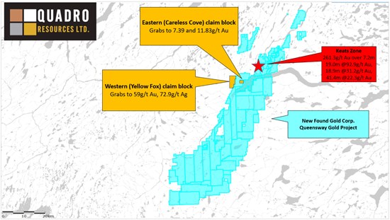 The Property is located within the Central Newfoundland Gold Belt, eleven km southwest of New Found Gold’s (NFG.V) Keats Zone where drilling is defining a very high-grade mineralized zone which includes recent intersections up to (see NFG press release dated April 20, 2021). Quadro’s claim licenses are partially surrounded by NFG’s Queensway Project and are immediately west of the south-southwest striking Appleton Fault Zone corridor, which hosts the Keats Zone mineralization. (Note – Mineralization hosted on the Queensway Project is not necessarily indicative or representative of the mineralization that may be hosted on the Company’s property.)