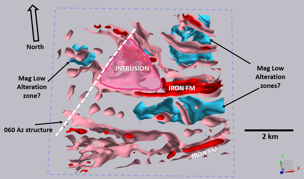 - Associated large areas magnetic lows suggesting areas of silicification and alteration leading to magnetic destruction. There are three such large areas identified to the southeast (~4.0 x 1.0kms), northeast (~2.0 x 2.0kms) and northwest (~1.0km x 1.0km) of the proposed intrusion (Figure 3).