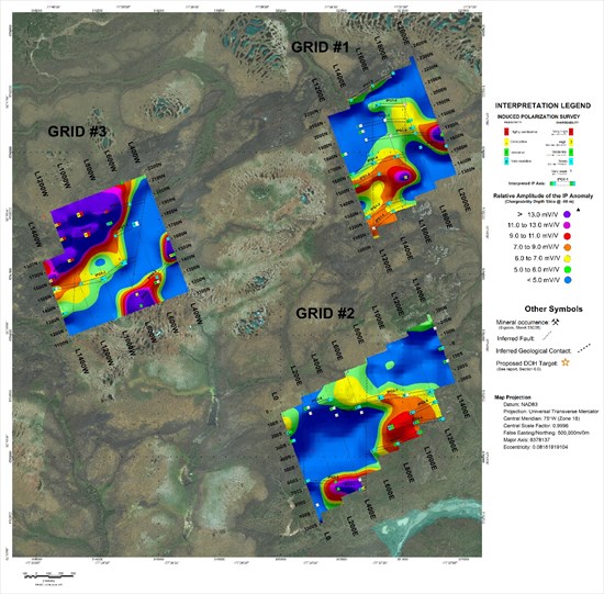 Induced polarization (IP) is a geophysical imaging technique used to identify the electrical chargeability of subsurface materials, such as sulphides. The dipole-dipole electrode array was used for this induced polarisation survey. The program aids in detecting the presence of sulphide mineralization below the earths surface as well as areas of increased or decreased resistivity which may indicate hydrothermal activity. Disseminated sulphides, including pyrite, chalcopyrite, and arsenopyrite, are associated with gold mineralization found in grab samples at Golden Giant.