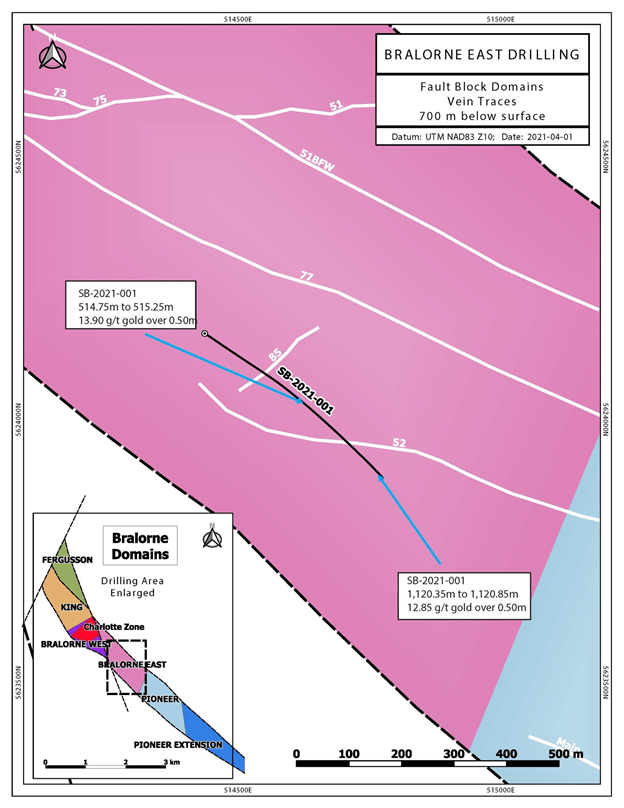 Hole SB-2021-001 was the first hole drilled to the east of the Empire fault and was designed to target near-surface gold mineralisation within the Bralorne East Block, and today’s results represent the second half of the hole following the release of the first half in the Company’s press release of March 16, 2021. High-grade gold mineralisation intersected at 514m downhole is ~300m from the nearest high-grade intersection (Figure 2, Figure 3b and Table 1), further expanding high-grade gold mineralisation to the southeast.
