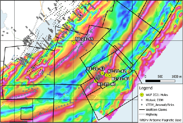 Bore hole electromagnetic surveys (BHEM) were completed down holes RI-21-40, 41 and 42. Preliminary results indicate in-hole anomalies associated with the sulphide mineralization in holes RI-40 and 42. A complete interpretation is the BHEM survey data is pending.