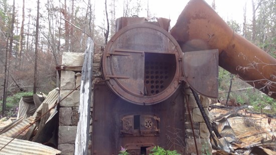 Photo 1: 1909 Minesite boiler after the 2018 forest fire