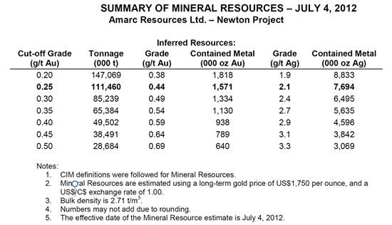 The Newton Gold Project includes more than 30,000 m of drilling, and a 2012 historic mineral resource estimated at the inferred confidence level for 1.6 million ounces gold (Au), and 7.7 million ounces silver (Ag), as reported in a NI 43-101 technical report effective dated December 19, 2012 entitled “Technical Report on the Initial Mineral Resource Estimate for the New Project, Central British Columbia, Canada”, prepared by Reno Pressacco, M.Sc.(A), P.Geo., for Amarc and filed under Amarc’s profile on www.sedar.com (the “Newton Technical Report”). This inferred mineral resource estimates a grade of 0.44 g/t Au and 2.1 g/t Ag. at a cut-off grade of 0.25 g/t Au. The mineralization is typical of bulk-tonnage, low to intermediate sulphidation, disseminated epithermal gold-silver deposit. Mineralization occurs within an 800 x 400 m area defined by drilling to depths of 560 m, but primarily of depths only down to 300 m, representing a fraction within a larger 7 square kilometer hydrothermal system as defined by an induced polarity chargeability anomaly. Drill results reported in the Newton Technical Report suggest that the gold and silver mineralization may be expandable with additional possibilities to discover structurally controlled zones of higher-grade gold.