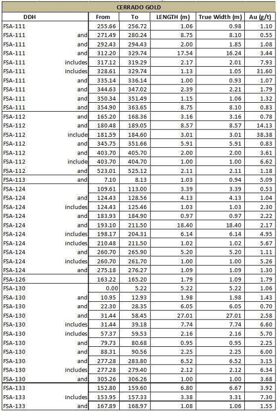 The drill results reported in this press release were received up until May 7th, 2021 and represent complete results for FSA 111, thru 113, FSA 124, FSA126, FSA 130, and FSA 133. Including the assays for holes reported today, Cerrado has reported assay results for 25 of 55 holes drilled in the Phase I program. The results indicate that these drill holes have been very successful in confirming and expanding the mineralization.