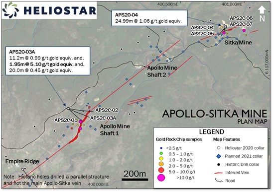 The Apollo drill program focuses on the Apollo Shaft 2 area before expanding to include drilling at Sitka Mine, to the east, and the Apollo Shaft 1, to the west (Figure 3). The Apollo Shaft 2 area has never been drilled despite being the focus of significant historic exploration at the time of original mining between 1886 and the 1920s that comprised shaft sinking, drifting, and cross cutting to discover veins. Historic reports note that many drifts and crosscuts encountered veins with gold, silver and base metals. These zones of defined mineralization were not mined due to the lack of flotation technology to treat sulphide ore, technology that has now been industry-standard for multiple decades.