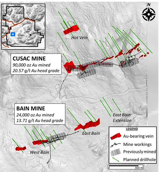 Figure 1. Distribution of planned 2021 confirmation and extension drilling near Bain and Cusac mines, South Cassiar. Targets are primarily lateral or down-dip extensions of known or previously mined high-grade veins. Blue box in inset map shows location within Cassiar Gold property.