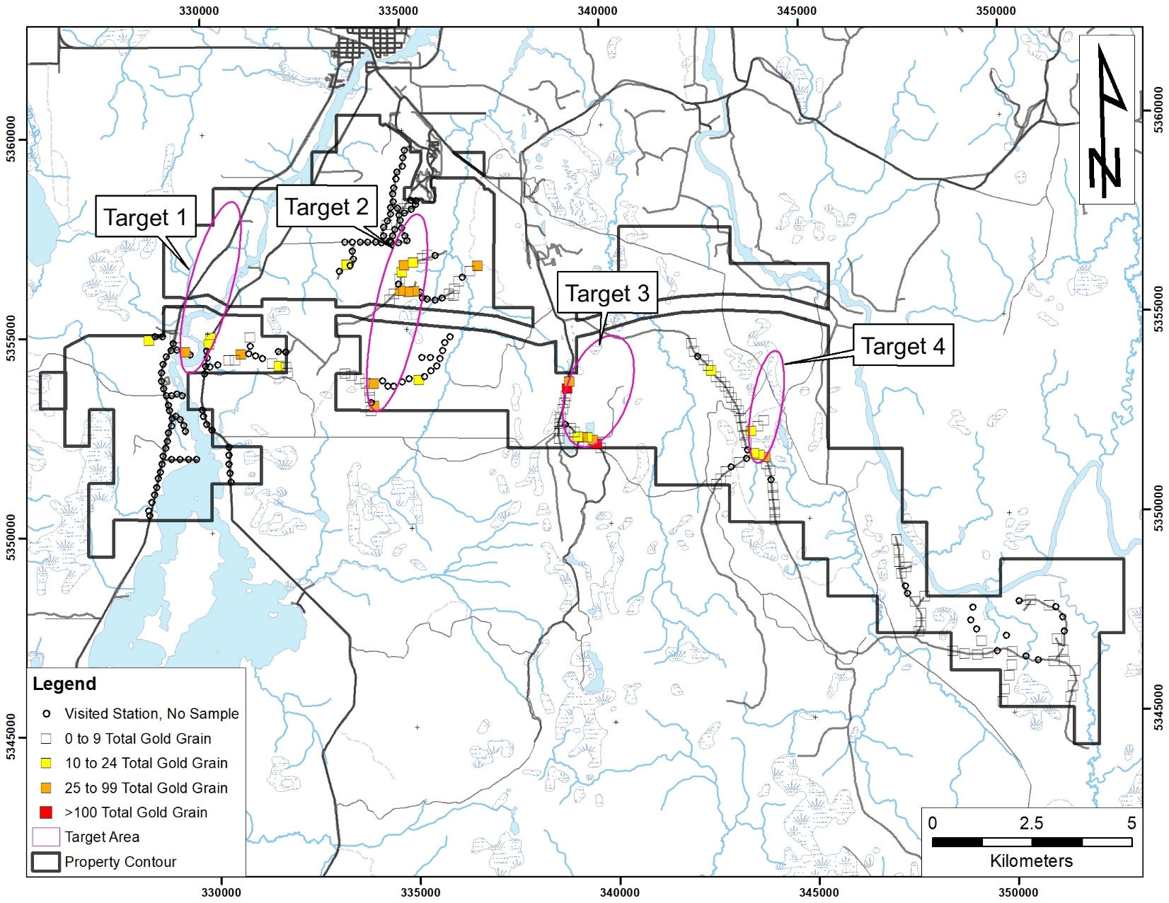 Target 4 is a small cluster of medium to high total gold grains (10, 19, 19 and 30 total grains).