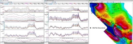 Fig 3. EM anomaly 16-3 in profile showing SFz (dB/dt) conductivity in the mid to late time channels(as well as a positive B Field) shown on a map of the total field magnetics.