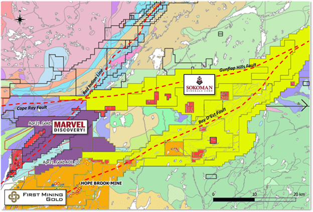 Figure 2. Location of Marvel’s Hope Brook gold property contiguous to First Mining and the Sokoman-Benton joint venture.