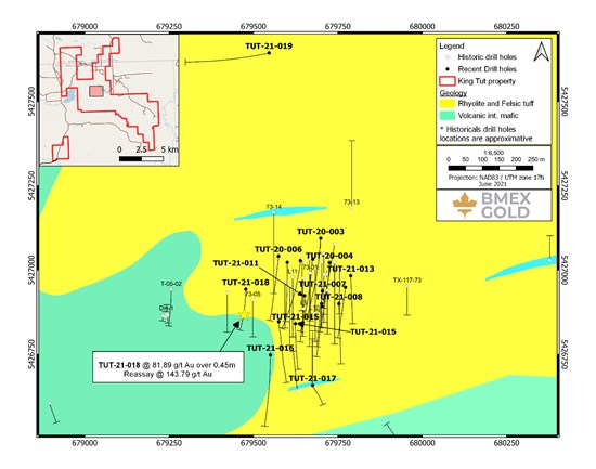 Vancouver, British Columbia–(Newsfile Corp. – June 14, 2021) – BMEX Gold Inc. (TSXV: BMEX) (OTCQB: MRIRF) (FSE: 8M0) (“BMEX” or the “Company“) is pleased to announce that diamond drill hole TUT-21-018 has intersected visible gold assaying 81.89 g/t Au over 0.45 metres at its King Tut Gold Project (“King Tut” or the “Project“), located in the Abitibi region of Quebec, Canada (Figures 1 and 2). A re-assay of the sample returned 143.79 g/t Au. All assay results for the Company’s recently completed its 2020-21 drill program at King Tut have now been received. Results for drill holes TUT-21-011 to TUT-21-019 can be found in Table 1; collar coordinates and hole orientations are listed in Table 2. Previous results were reported in press releases dated March 11, 2021 and March 23, 2021.