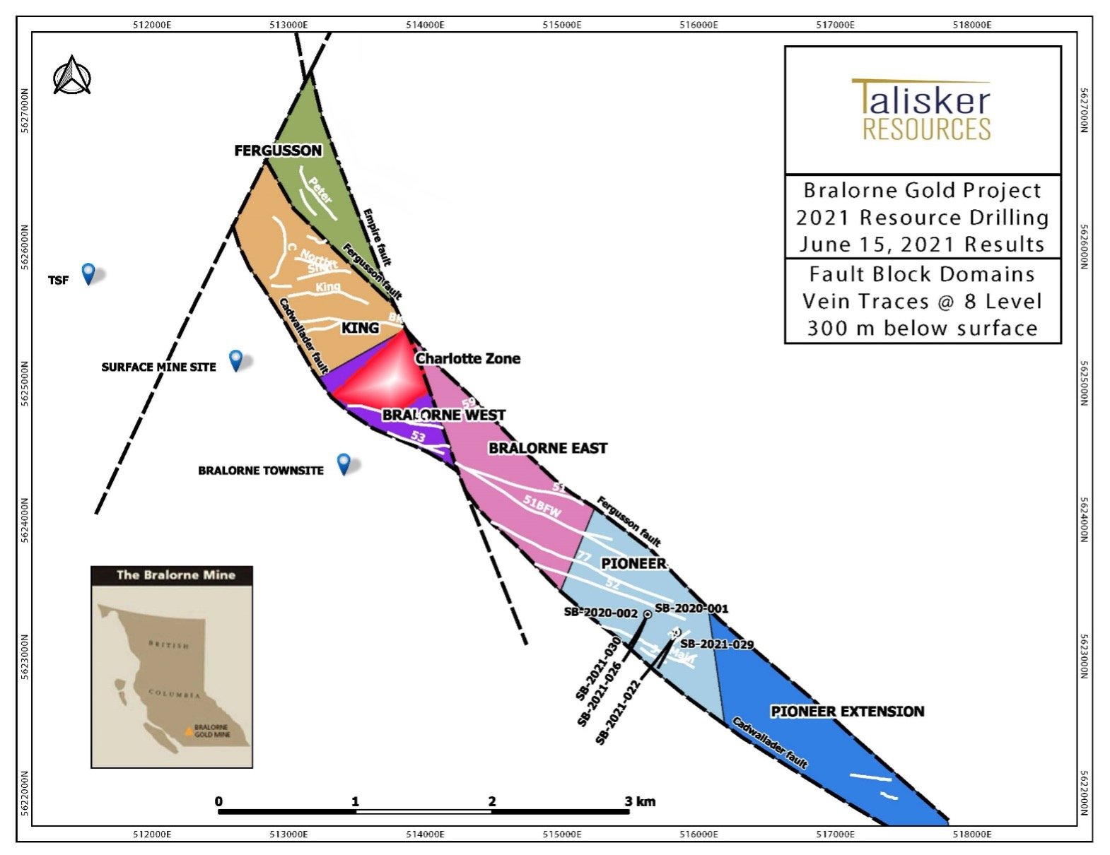 TORONTO, ON / ACCESSWIRE / June 22, 2021 / Talisker Resources Ltd. (‘Talisker’ or the ‘Company’) (TSX:TSK)(OTCQX:TSKFF)is pleased to announce complete and partial drill assay results from its ongoing 100,000 metre drill program at the Bralorne Gold Project in British Columbia (see Figure 1). Today’s release is headlined by a 106.75 metre interval of near-surface bulk-tonnage gold mineralization within the Pioneer Block that returned an average grade of 1.17 g/t gold in hole SB-2021-026 (see Figure 1); assay results are also included for holes SB-2021-022 and SB-2021-029 drilled within the Pioneer Block. This near-surface gold mineralization at Pioneer is hosted in a coarse-grained felsic intrusive and is characterized by excellent grade consistency (see Table 2). More drilling is required to determine the lateral and vertical extents and geometry of the felsic intrusive hosting these broad zones of near-surface gold mineralization at Pioneer. With five drill rigs operating on site, the Company expects to receive more assay results from both the Charlotte Zone (0 to 350m) and the High-Grade Zone (350 to 750m) soon.