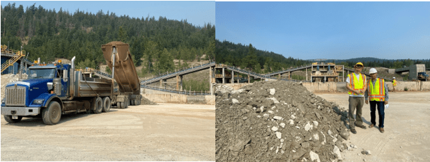 Nicola Mining’s President, Peter Espig (left) with Blue Lagoon Resources President & CEO, Rana Vig, standing at mill site next to newly arrived shipment of Dome Mountain’s high-grade mineralized material
