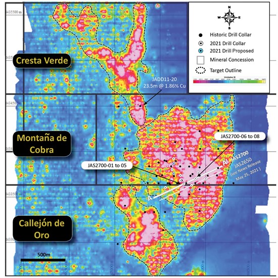 Montaña de Cobre drilling is demonstrating that skarn hosted copper-gold mineralization is open in all directions and extends both laterally and along strike. The drill rig is currently positioned on section line JAS2800 (150m grid north of our first section reported on JAS2650) drilling the second of a planned three holes. Drill section spacing is planned to increase to 100 metres at the completion of the JAS2800 drill fan, as the rig progresses a further 800 metres northward towards the Cresta Verde Zone. An historic hole, JADD11-20 on that zone intersected 23.5m at 1.86% Cu5 from 19m.