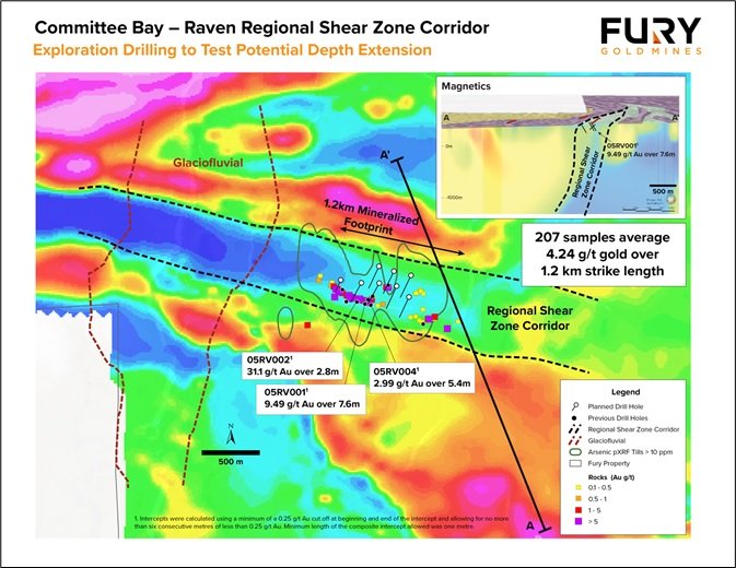 Fury plans to drill the Raven prospect through aggressive step outs up to 500m down plunge from historical drilling to demonstrate the scale of the system and to explore the entire length of the 8km shear zone to define new targets through systematic till sampling and geological mapping.