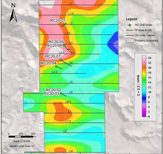Figure 2 is one example of an east-west IP sideview cross-sections or Inverted sections, that demonstrate the core of the untested chargeability anomaly or root system with depth, and its proximity to the Company’s fall 2020 drilling (RC20-01). The upper contact of the lower plate Rodeo Creek and Popovich units are interpreted from drill data and coincide with the anomaly. Rodeo Creek and Popovich units are the host rocks to the majority of the big, and also the compact high grade gold deposits and mines in the Carlin Trend. The hole in progress is angled at 60o to the west into the anomaly from the same collar location as RC20-01.
