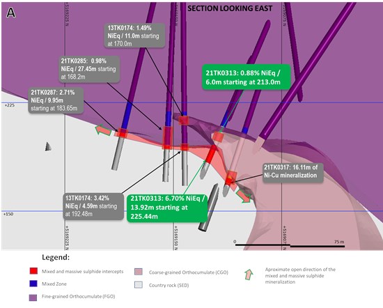 Figure 3: Section A represents a portion of the CGO West area looking east showing the thick intersections of nickel-copper mineralization found in drill holes 21TK0313 and 21TK0317.