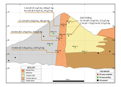 Hole HDD-21-004 at La Peña vein intersected 14.8m at 3.96 g/t Au and 1,097 g/t Ag. This is the deepest intercept on the La Pena vein system to date with silver grades increasing with each step down.
