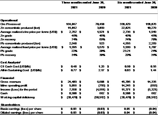 - The Company processed 164,047 tonnes of mineralized material, averaging 1,803 tonnes per day, grading 4.5% zinc, 0.34% copper, 129 g/t silver and 1.16 g/t gold