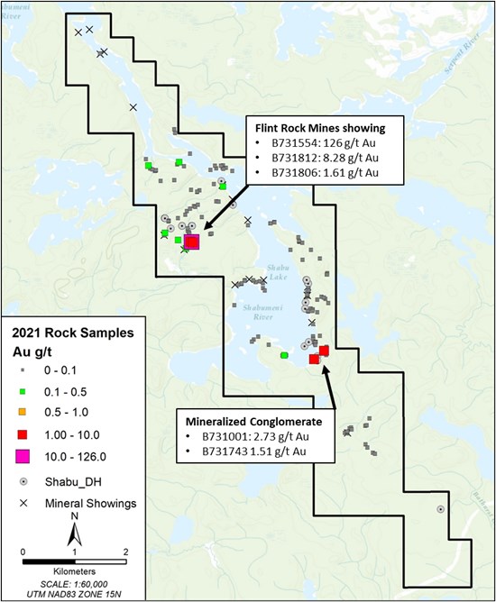 A total of 191 rock samples were sent to ALS Laboratories for analysis, returning gold values ranging from nil to 126 g/t Au. Table 2 shows assay results for rock samples containing >0.1 g/t Au. Highlights of the program include: 1) Identifying a new area of mineralization that has not been previously documented, including 2.73 g/t Au and 1.51 g/t Au hosted in strongly foliated, ankerite altered conglomerate, and 2) Follow-up of the high-grade Flint Rock Mines vein returned 126 g/t Au, 8.28 g/t Au, and 1.61 g/t Au in EW trending quartz veins. Significant assay results are listed in Table 2, and sample locations are plotted in Figure 2.