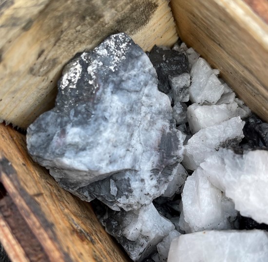 - Acanthite (silver sulphide with 87.1% silver content) associated with the above minerals in DDH-21-10 (see photo).