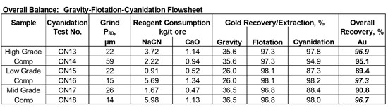 - Excellent overall gold recoveries using relatively simple processing options