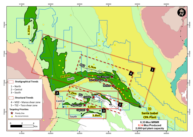 - The newly defined prospective trends are distinct geological entities propagating off the major crustal scale Paciência – São Vicente lineament. This regionally important lineament is a major gold bearing geological structure transecting the Rio das Velhas Greenstone Belt, and within the area of interest, hosts two of Jaguar´s underground mines (Santa Isabel and Marzagão – currently in-active) which previously provided feed to the 2,000 tpd Paciência (CPA Plant – currently on care-and-maintenance).