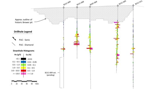 Pancon President and CEO Layton Croft stated: “Holes 11 and 12 extend, to the north and west, the gold-copper mineralized zone below the former Brewer mine. This zone now spans 275 m on a north-south axis, with a mineralized hole 50 m to the east and another mineralized hole 50 m to the west (see Figure 2). The bigger picture is getting clearer. Our next phase of drilling will include a grid of holes to expand our understanding of this gold-copper mineralized zone below the former mine, with the objective of defining a maiden resource in 2022.”